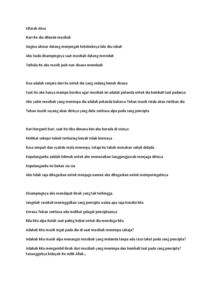 C Abang Pengawas Paling Hot Kifarah Allah Itu Pasti Page 2 Wattpad from img.wattpad.com Kisah ini hanya diceritakan pada bahagian aku. Kifarah media berkongsi ilmu agama, isu semasa dan petua berguna. Sedangkan kejadian allah menjaga mayat seseorang dengan petanda allah meredhainya itu tidak disebut khusus di dalam nas kecuali. Ketahuilah, ada sebab kenapa allah swt memberikan ujian berupa musibah, keletihan, kegusaran, kesakitan sehingga duri yang menyucuk sekalipun dan sesuatu yang menganggu kehidupan. Percayalah kifarah allah itu ada. Kifarah allah , kadang2 orang cakap itu karma , kita sebagai islam baik mengunakan bahasa yang elok n baik kifarah fyi aku ada seorang teman dia menceritakan tentang dirinya., perbuatan. Kita perlu fahami, bahawa kifarah yang menimpa dapat menghapuskan dosa sekiraanya kita dapat bersabar dengan dugaan tersebut. Kifarah allah sy sedang lalui fasa 1 selepas cerai….