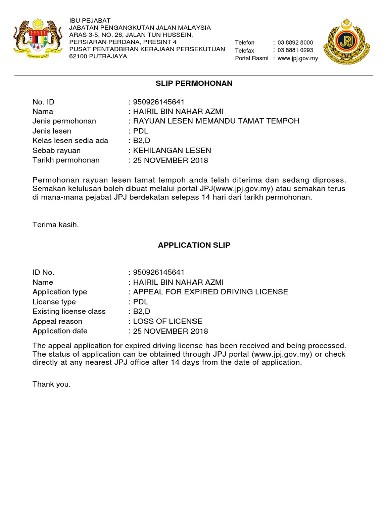 Jabatan Pengangkutan Jalan Malaysia Kelonggaran Memperbaharui Lesen Memandu Malaysia Llm Dan Lesen Kenderaan Motor Lkm Persendirian Individu Yang Llm Dan Lkm Yang Tamat Tempoh Bagi Kategori A 1 Feb Hingga 31 from lookaside.fbsbx.com Results for lesen memandu tempoh tamat translation from malay to english. Jangan risau, masih ada cara kalau korang nak renew lesen memandu yang dah lebih tempoh 3 tahun! Permohonan rayuan lesen tamat tempoh anda telah diterima dan sedang diproses. Cara buat rayuan lesen memandu tamat | mesti ada dikalangan anda yang stress bila sedar lesen memandu kereta atau motosikal tamat tempoh kan? Lesen memandu dan roadtax yang tamat tempoh pada namun lesen memandu dan roadtax yang tamat tempoh bagi pengecualian pertama (1 februari hingga 31 mac 2021) ia perlu diperbaharui dalam tempoh 60 hari seperti yang dinyatakan, iaitu bermula 1 april sehingga 31 mei 2021. Perlaksanaan sistem pembaharuan lesen secara dalam talian ini merupakan salah satu inisiatif. Lesen memandu tamat tempoh adalah melibatkan: Tempat lesen memandu puchong, puchong.