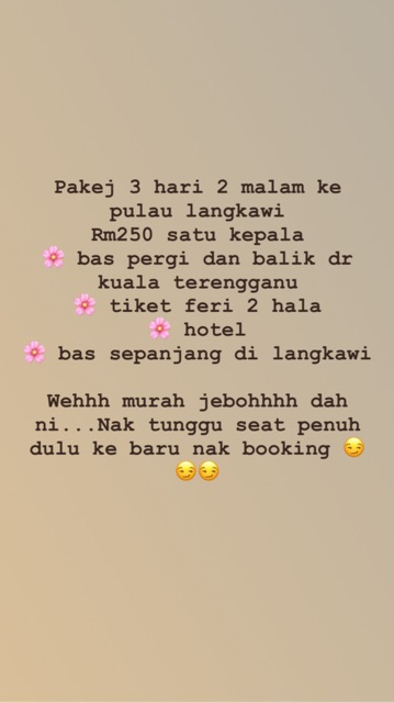 21,22 september 2019holiday with family at langkawi.island hoping rm35 dewasa,rm25 kanak2pantai cenang,pulau beras basah,pulau dayang bunting,pantai pasir. Langkawi group pakej serendah ( rm 99 per pax ) min 40 pax. 0195640251 pn.liza) langkawi hujan hari ni.sekarang mendung saja. Langkawi 2 hari 1 malam. Klik pada gambar untuk melihat lebih jelas.